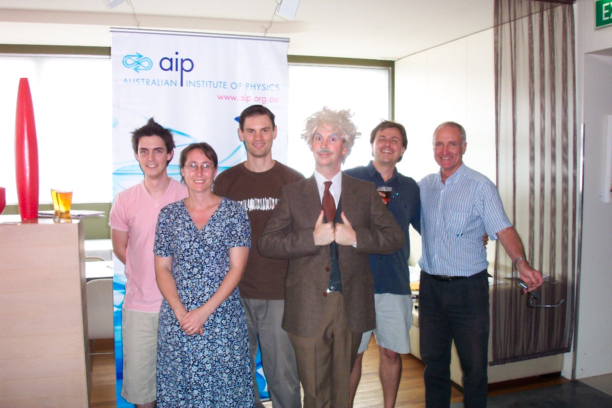 The debaters, organiser, subject, and moderator. (L to R: Matt Smith [D], Kate Wilson [D], Damian Pope [O], Albert Einstein [S], Andrew White [D], Robyn Williams [M]).