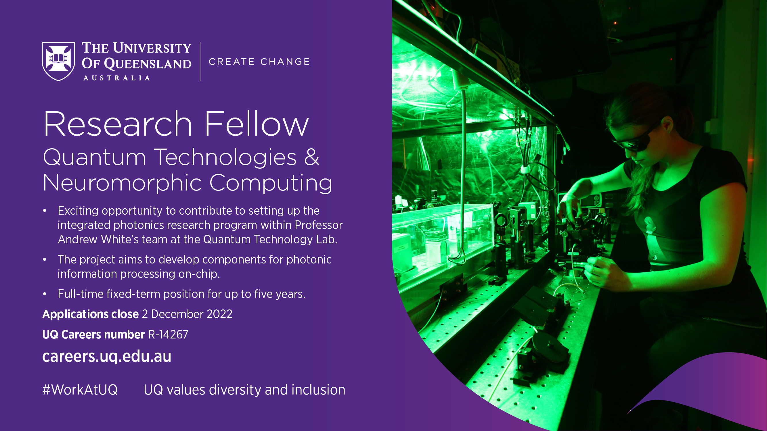- 28/10/2022: Exciting news: we are offering two five-year Research Fellowships in Quantum Technologies and Neuromorphic Computing, one here in Brisbane at the Quantum Technology Lab, and the other working in Sydney with Professor Sven Rogge at the University of New South Wales. If this appeals, please get in touch! (The Brisbane job application is live now, it closes December 2; we will update this page when the Sydney job ad goes live).