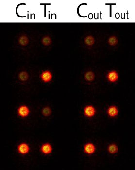 0, bright = 1); the right column represents the qubit outputs measured in the lab, where the intensities are scaled by the probabilities measured in our experiment.